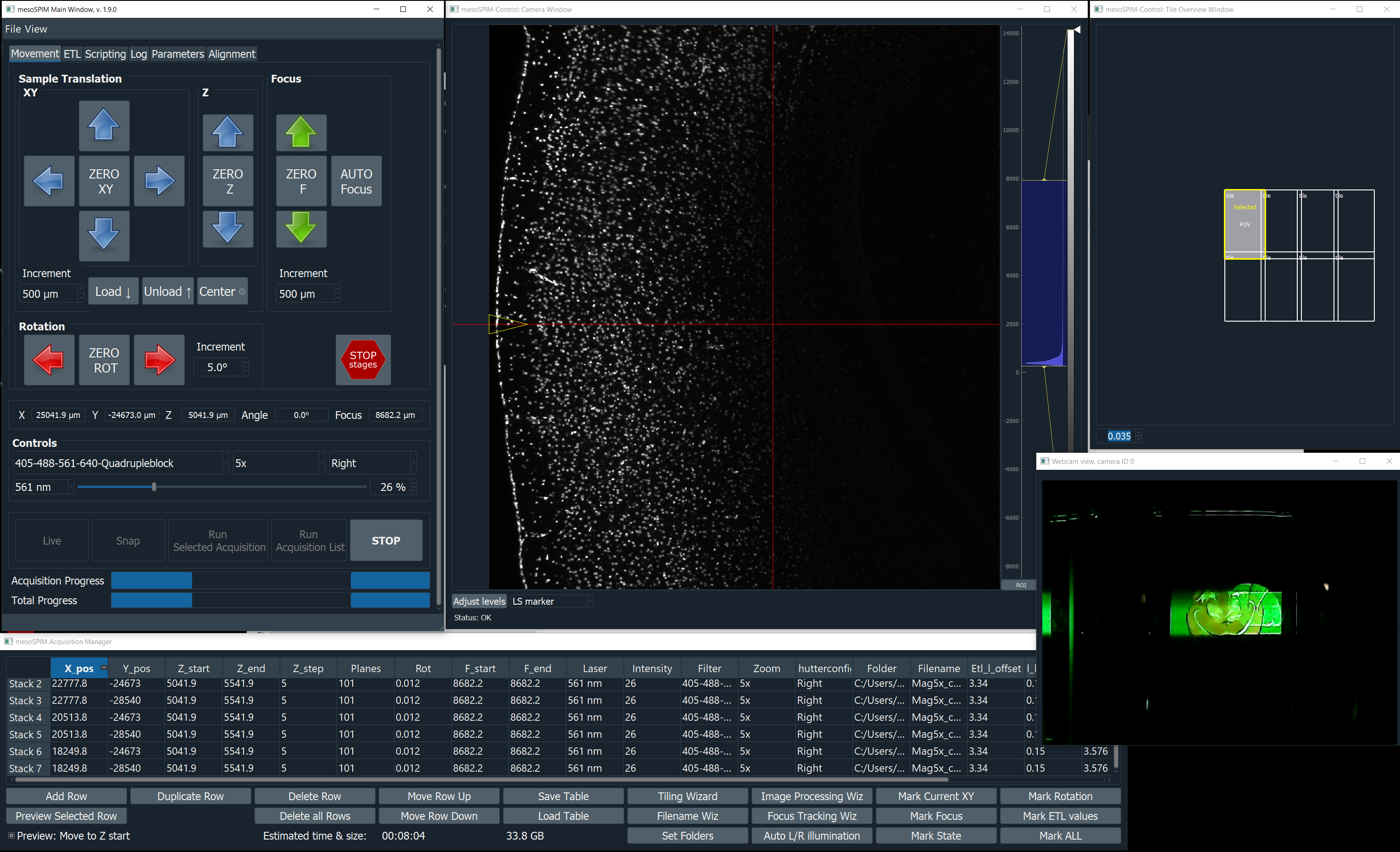 mesoSPIM-control v1.9 — Main window (left), Camera live view (centre), and Acquisition Manager (right).¶