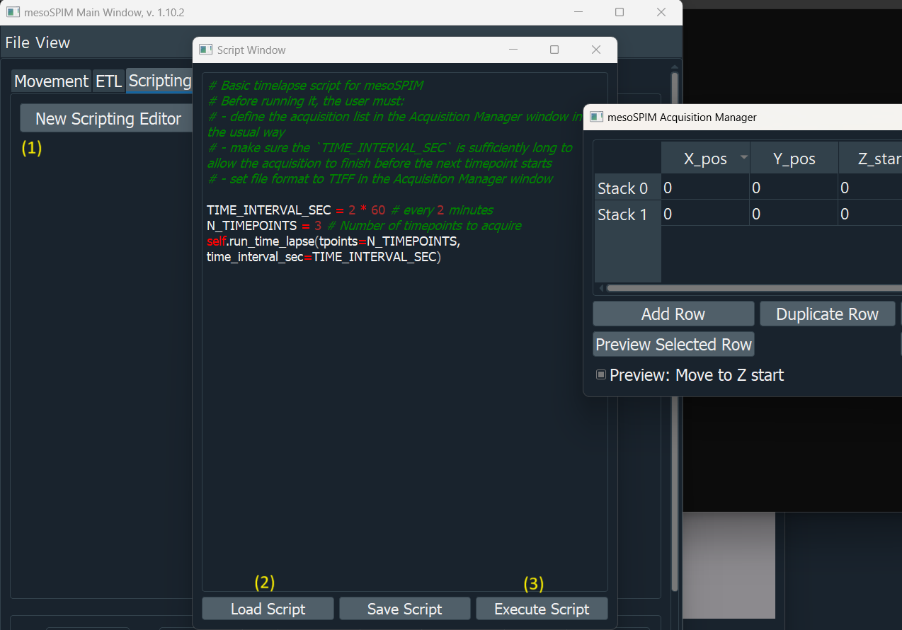 The script window exposes the full mesoSPIM Python API. Scripts run in the same process and can read/write the instrument state, move stages, snap images, and iterate over acquisition lists.